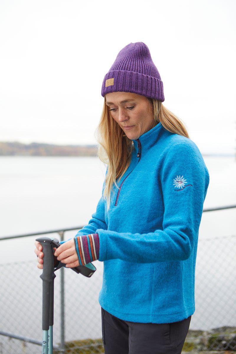 Dina half zip är en fantastisk tröja i 100% filtad ull med härliga inslag av glada accentfärger, där en randig, multifärgad mudd verkligen höjer plagget. Perfekt lager två under en tunn skaljacka. Passar ypperligt för den som gillar att vara aktiv. Tröjan är stickad hos oss i Gällstad, Sverige.