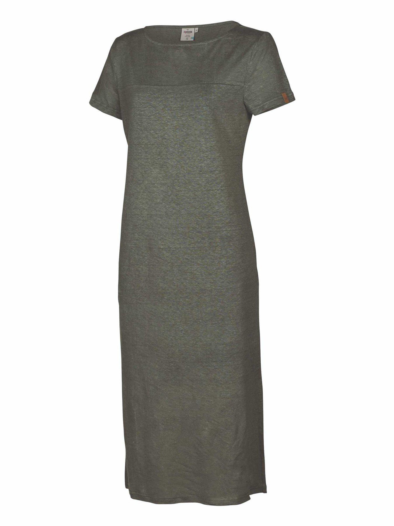 Härlig midiklänning i lin med snygg halsringning och slitsar i sidorna. Klänningen har en underklänning i 100% viskos, som både ger sval känsla och snyggt fall till plagget. Liten logo badge i jacron på vänster ärm.