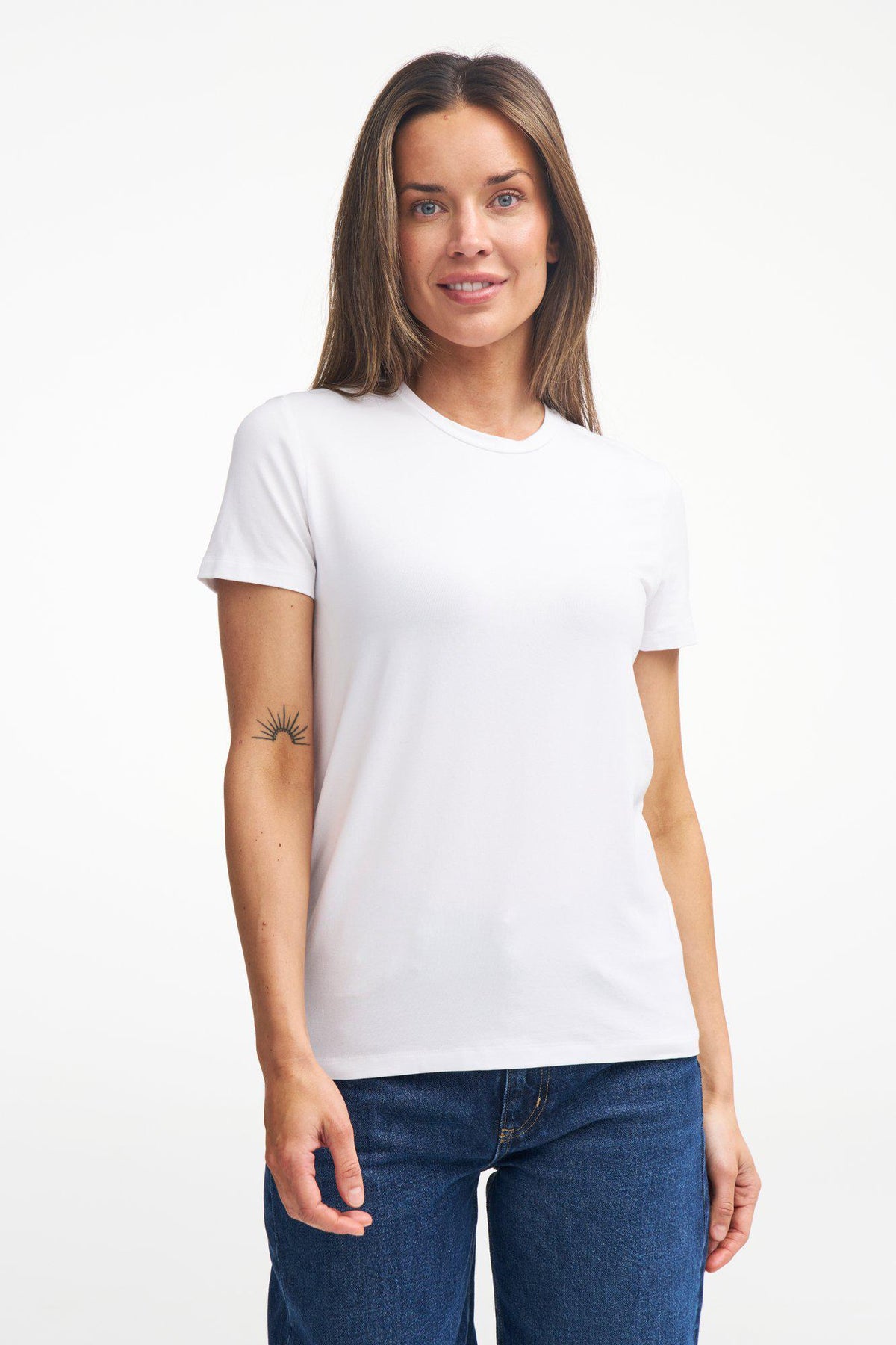 Ett bra basplagg i oslagbar kvalitet och känsla är väl något alla behöver?! Här har vi en högkvalitativ, sval T-shirt med härlig tyngd och bra passform. Upptill på vänster ärm sitter logo badge i jacron. Lika skön och funktionell på dina äventyr som klädsam och sommarfräsch till ett par jeans - välj själv! Plagg som är tillverkade av TENCEL™ transporterar fukt mycket bra och absorberar 50 procent mer fukt än bomull. TENCEL™ andas också bra, torkar snabbt och blir sällan skrynkliga. Modellen är 174 cm lång och bär storlek 38.