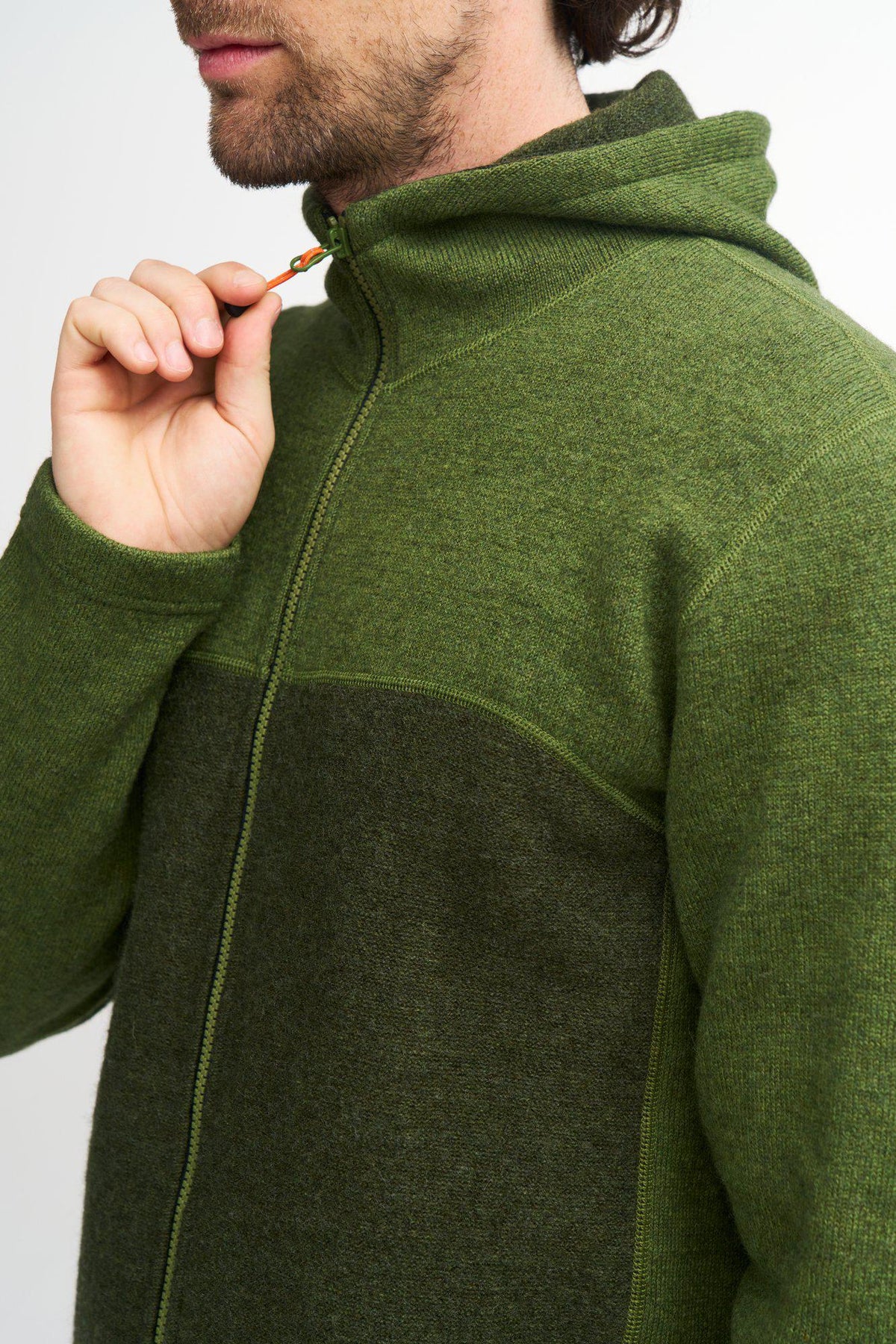 Ron Hood - en fantastisk ullhoodie med sportigt uttryck, där vi använder båda sidorna av det pläterade materialet för extra designeffekt. Hel dragkedja framtill och dragkedja i sidfickorna. Accentfärger i brodyr och zip pullers. En perfekt och lättburen jacka i mellansäsongerna. Stickad hos oss i Gällstad. Perfekta tröjan för de aktiva.