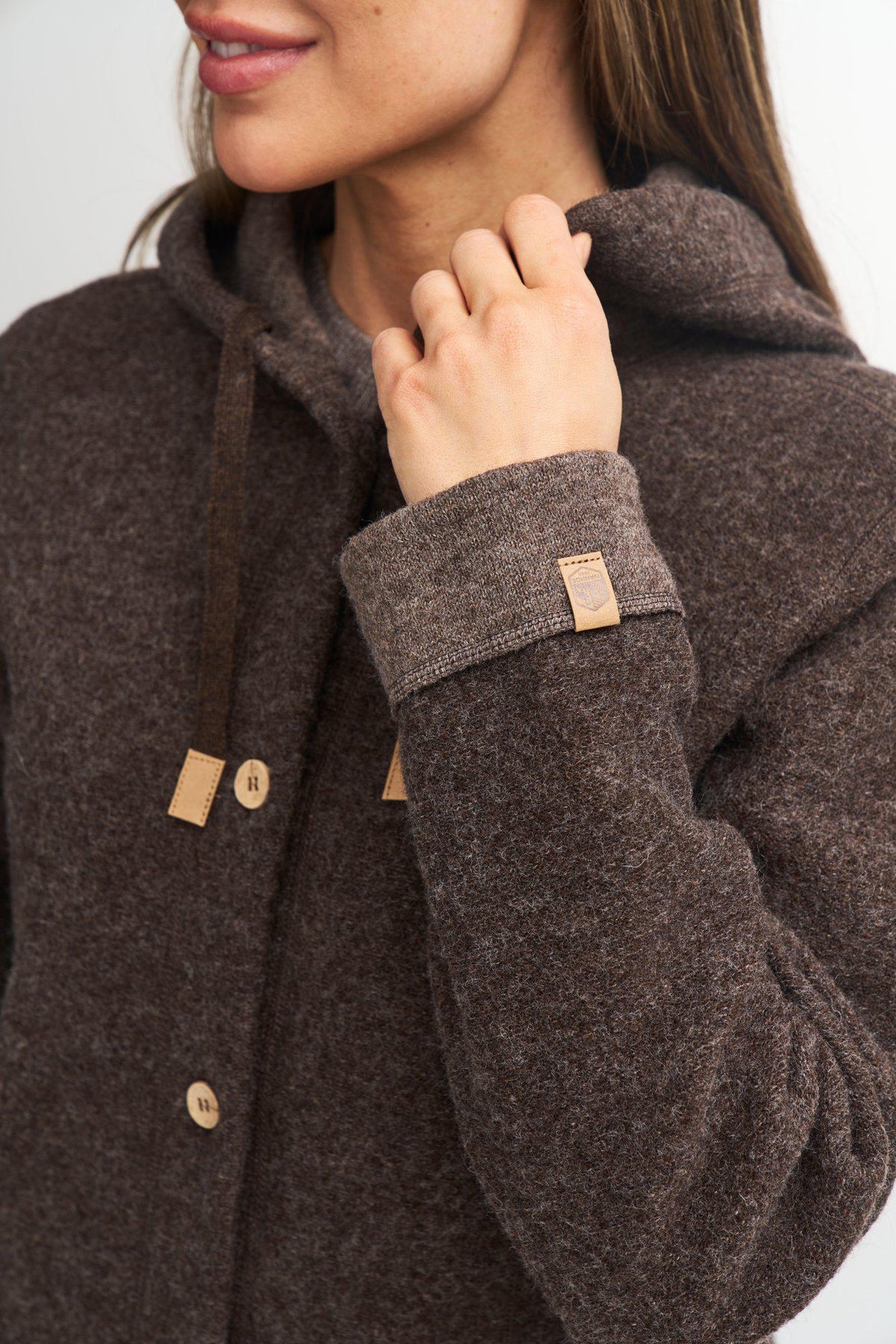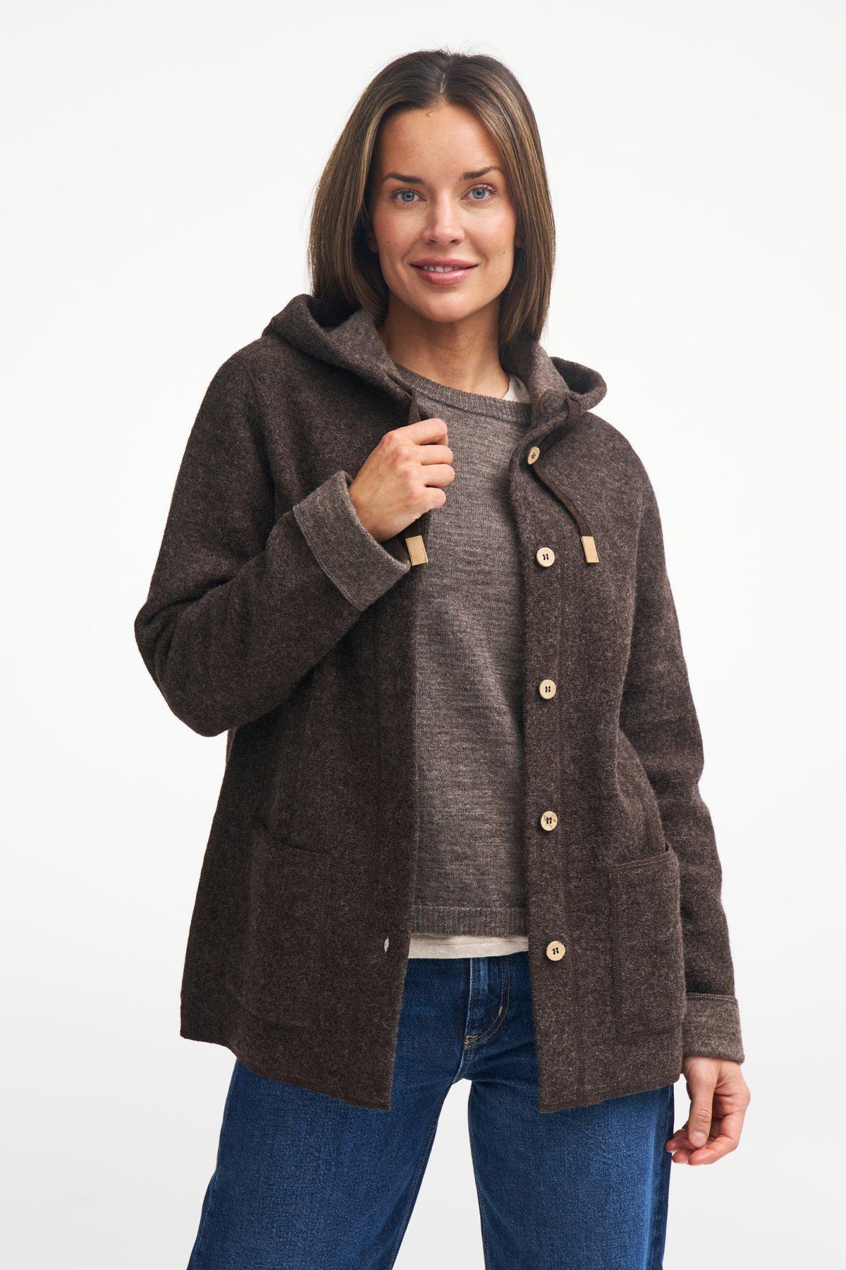 Den perfekta vårjackan kommer här! Smidig att slänga på sig och passar lika bra under skogspromenaden som på shoppingturen på stan. Stickad i 100% ull, där ullen är helt obehandlad och fri från kemikalier och färgämnen. Ulljackan har huva och generösa sidfickor. Knapparna framtill är gjorda av kokosnötskal, där varje knapp blir unik i färg och struktur. Logo badge i jacon upptill på vänster ärm. Modellen är 174 cm lång och bär storlek 38.