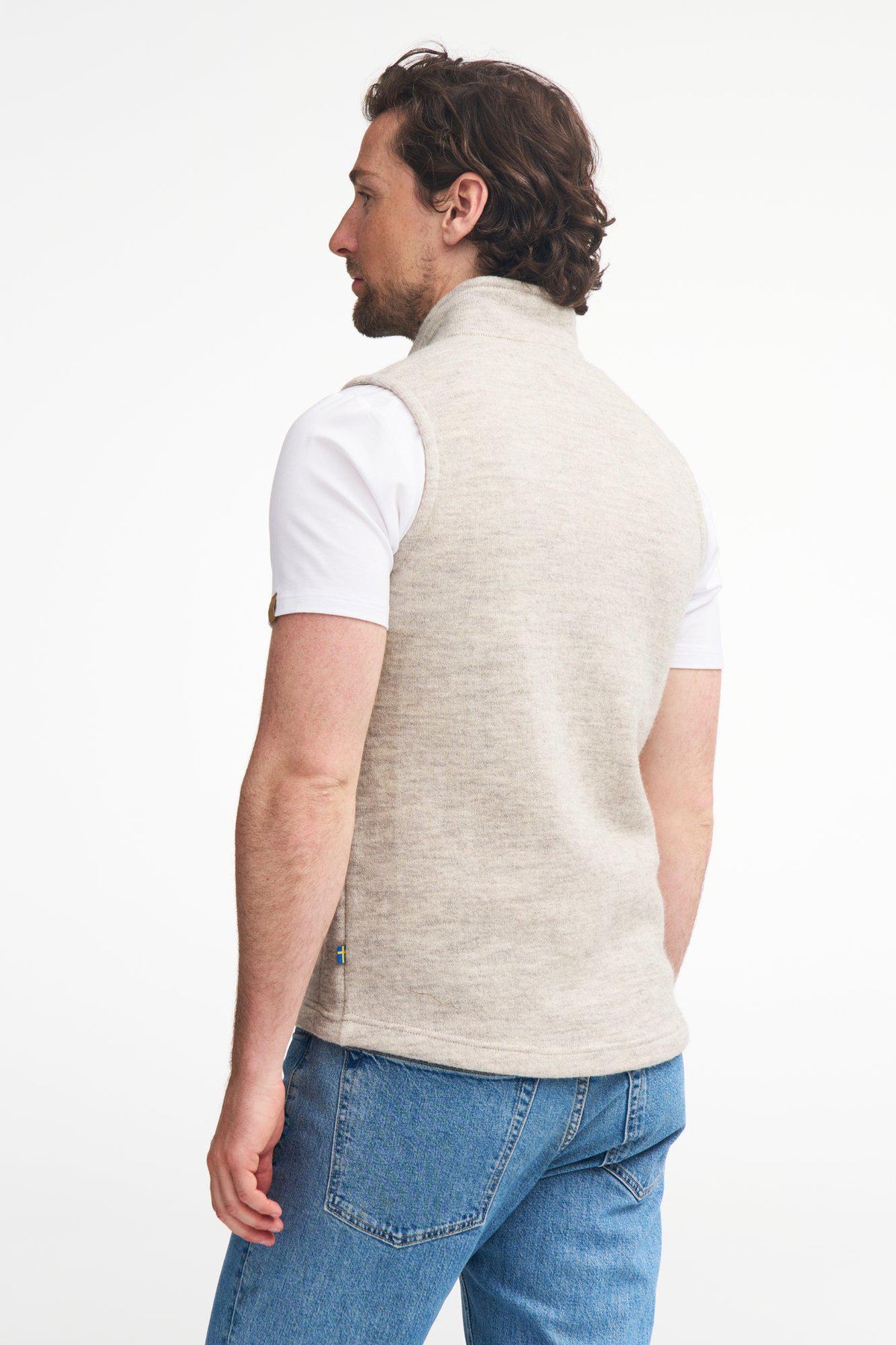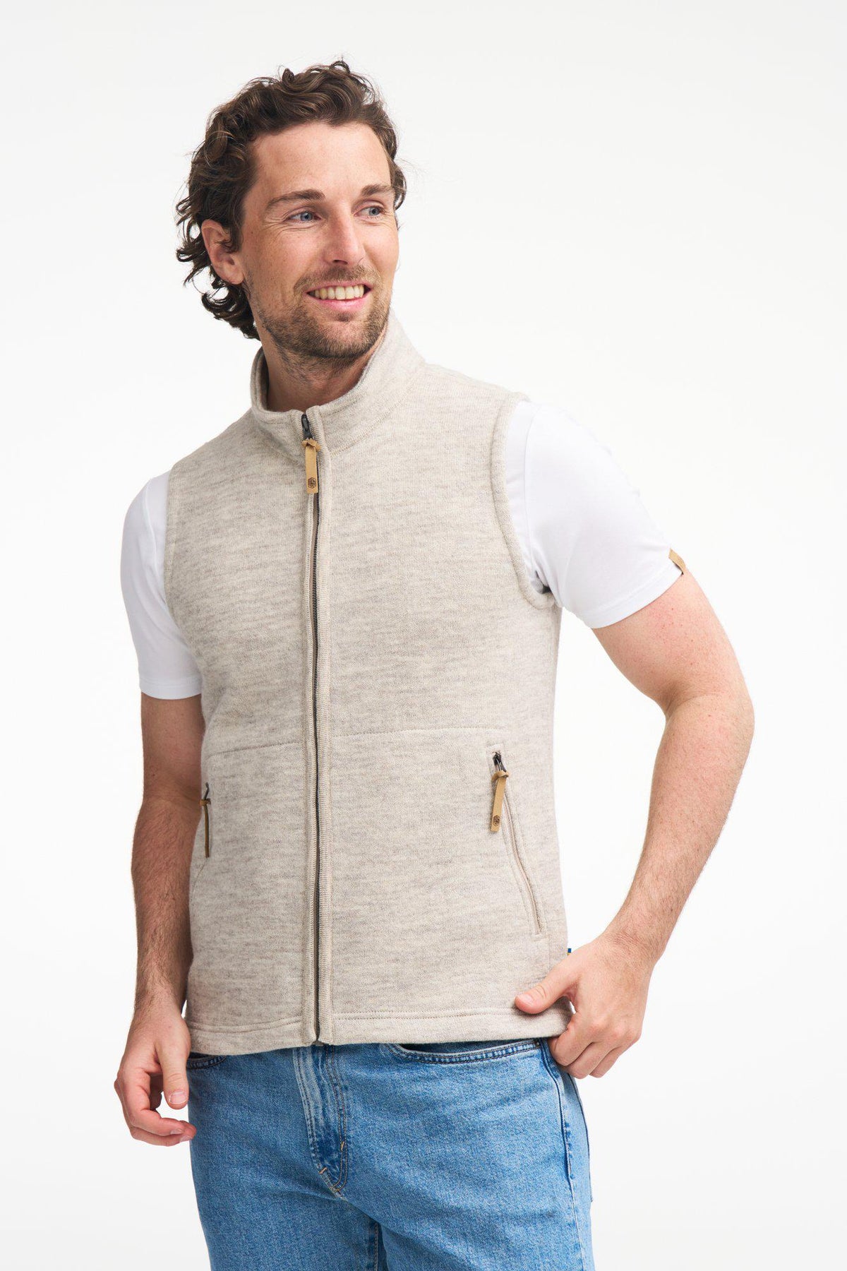 En fantastiskt snygg och användbar väst stickat i vår helt obehandlade och ofärgade ullkvalitet. Dragkedjan framtill är dold med ett stickat band, något som ger denna väst ett något annorlunda utseende mot vad vi är vana vid. Fickorna är försedda med dragkedjor och vår logga återfinns på jacron-märket nertill på vänster sida samt på zip pullers. Stickad i 100% ren ull. Modellen är 185 cm lång och bär storlek M.