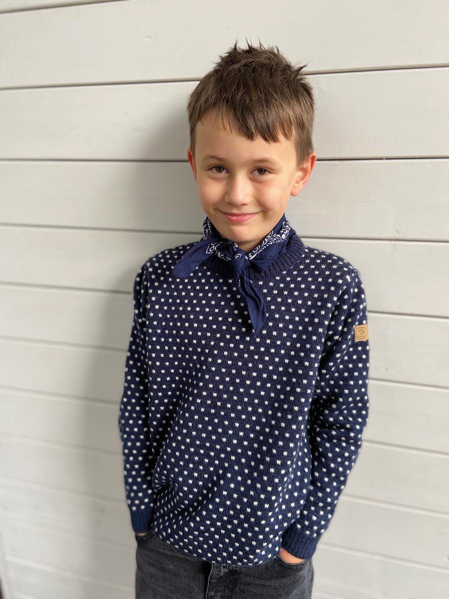Junior Sverre crewneck är en rundhalsad tröja i klassiskt mönster. Ribbstickad i hals remsa samt i muddarna nertill i ärm och body. Matcha gärna med tillhörande mössa JR Sverre hat för en optimal look. En härlig gosig tröja i 100% ull. Stickad hos oss i Gällstad.