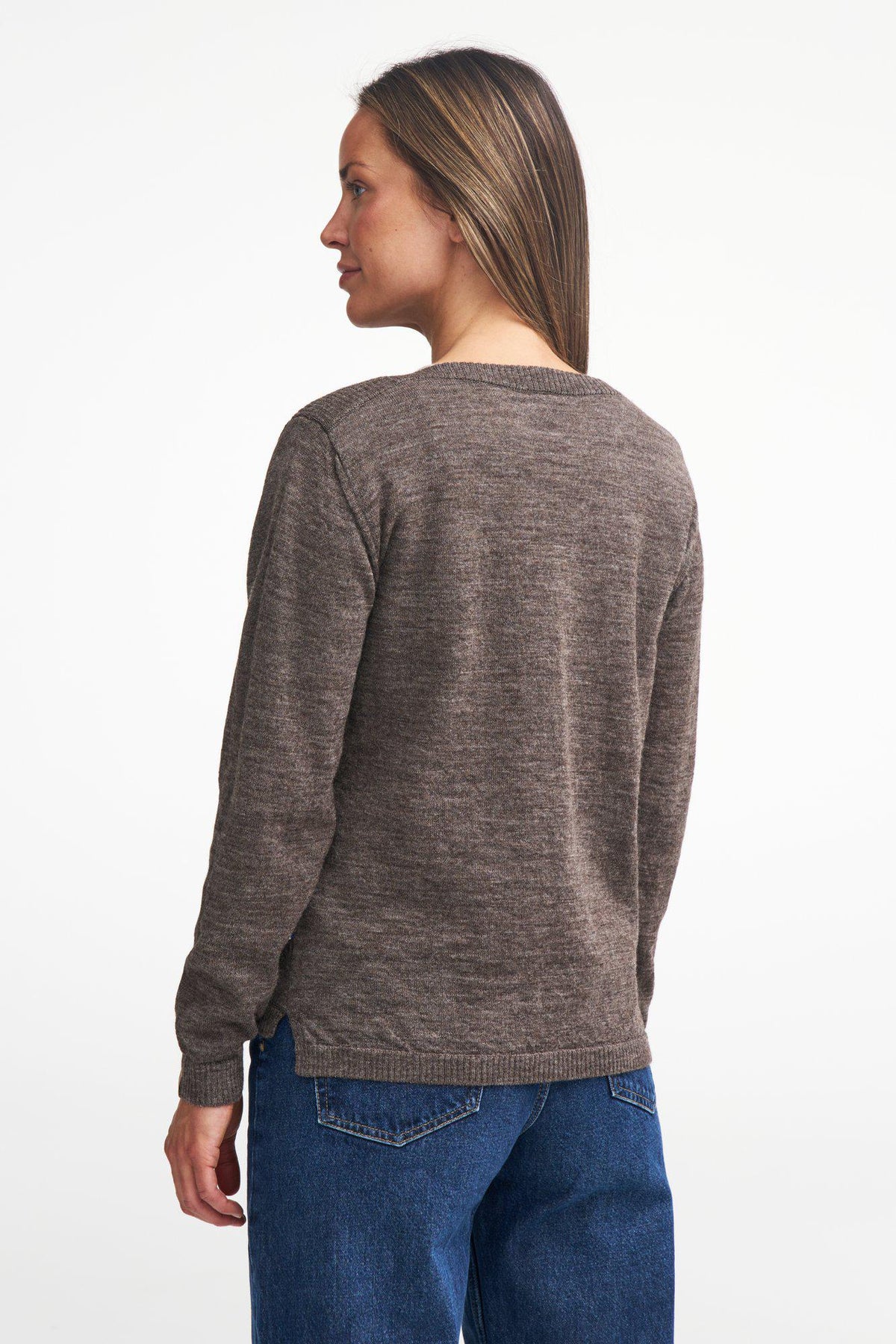 Tunnstickad tröja med snygg båthals. Bakstycket är något längre än framstycket, vilket ger ett schyst uttryck. Litet logomärke i jacron nertill på vänster ärm. Stickad i 100% obehandlad och ofärgad ull, helt utan tillsatser av kemikalier och färgämnen. Modellen är 174 cm lång och bär storlek 38.